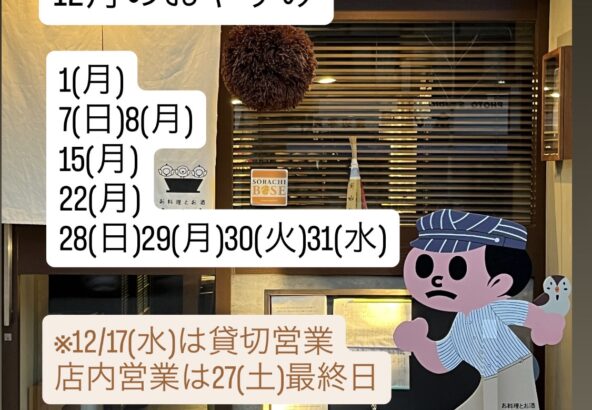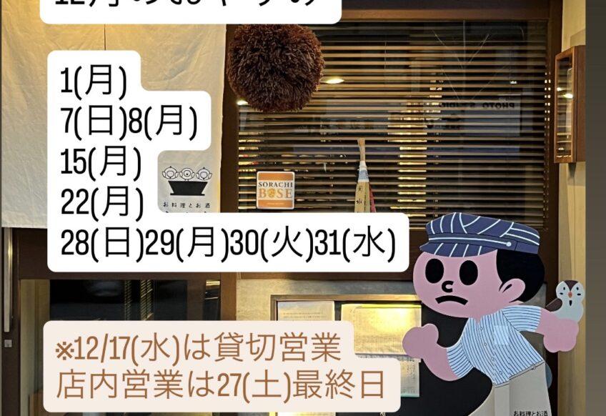 お料理とお酒ふくらです。 12月のおやすみのお知らせです。 ___________________ 12月のお休み ___________________ 1(月) 7(日)8(月) 15(月) 22(...