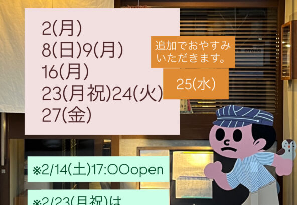 2月のお休みのお知らせです。 2/2(月) 8(日)9(月) 16(月) 23(月祝)24(火)25(水) 27(金) とお休みをいただきます。 2/14(土)は都合により17:00openです。 ...