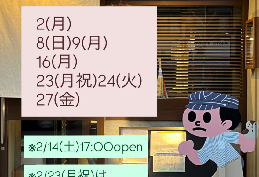 2月のお休みのお知らせです。 2/2(月) 8(日)9(月) 16(月) 23(月祝)24(火) 27(金) とお休みをいただきます。 2/14(土)は都合により17:00openです。 2/23(...