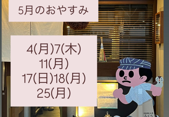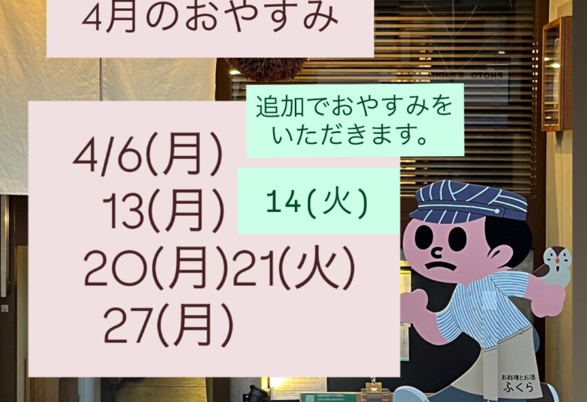 以前お知らせした4月の営業予定ですが追加で4/14(火)もおやすみいたします。 4/6(月) 13(月)14(火) 20(月)21(火) 27(月) みなさま春の味覚はもうお召し上がりになりましたか? たけのこ...